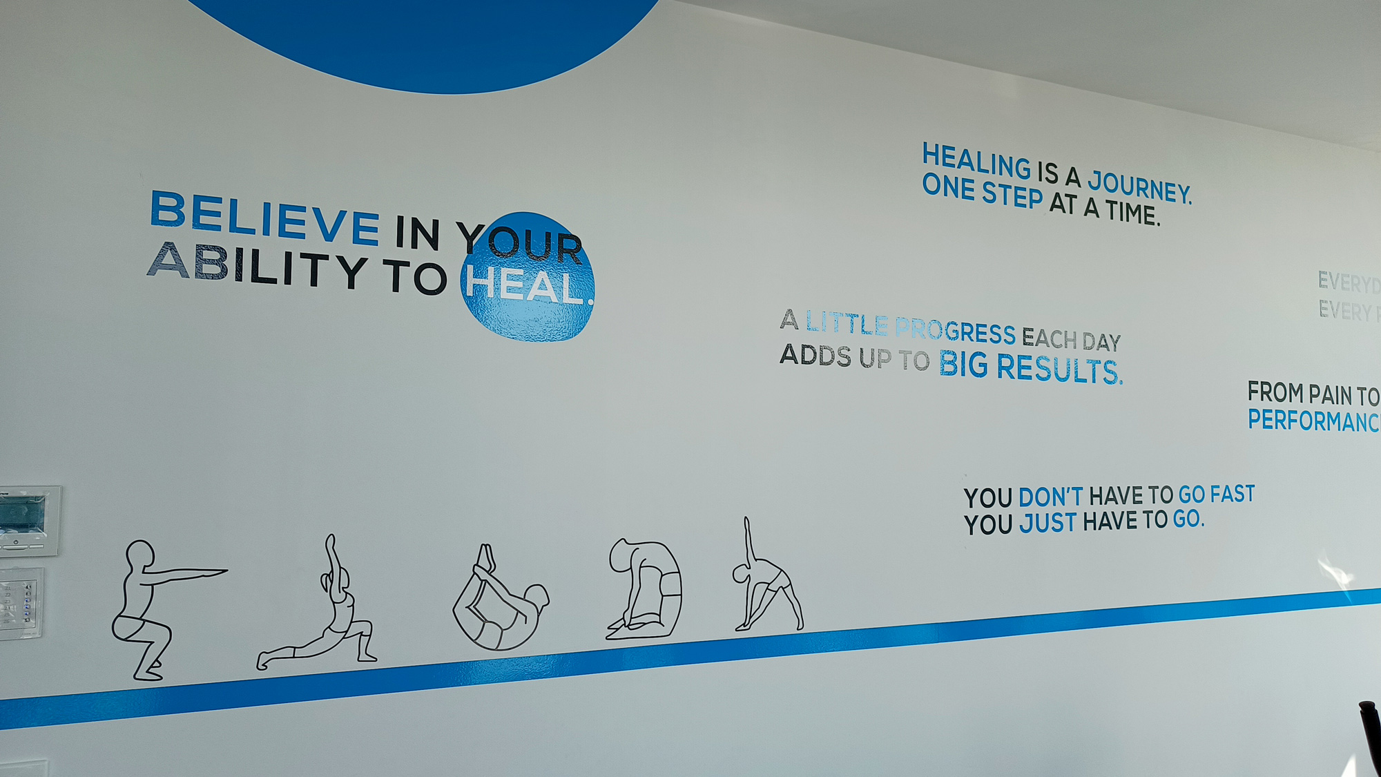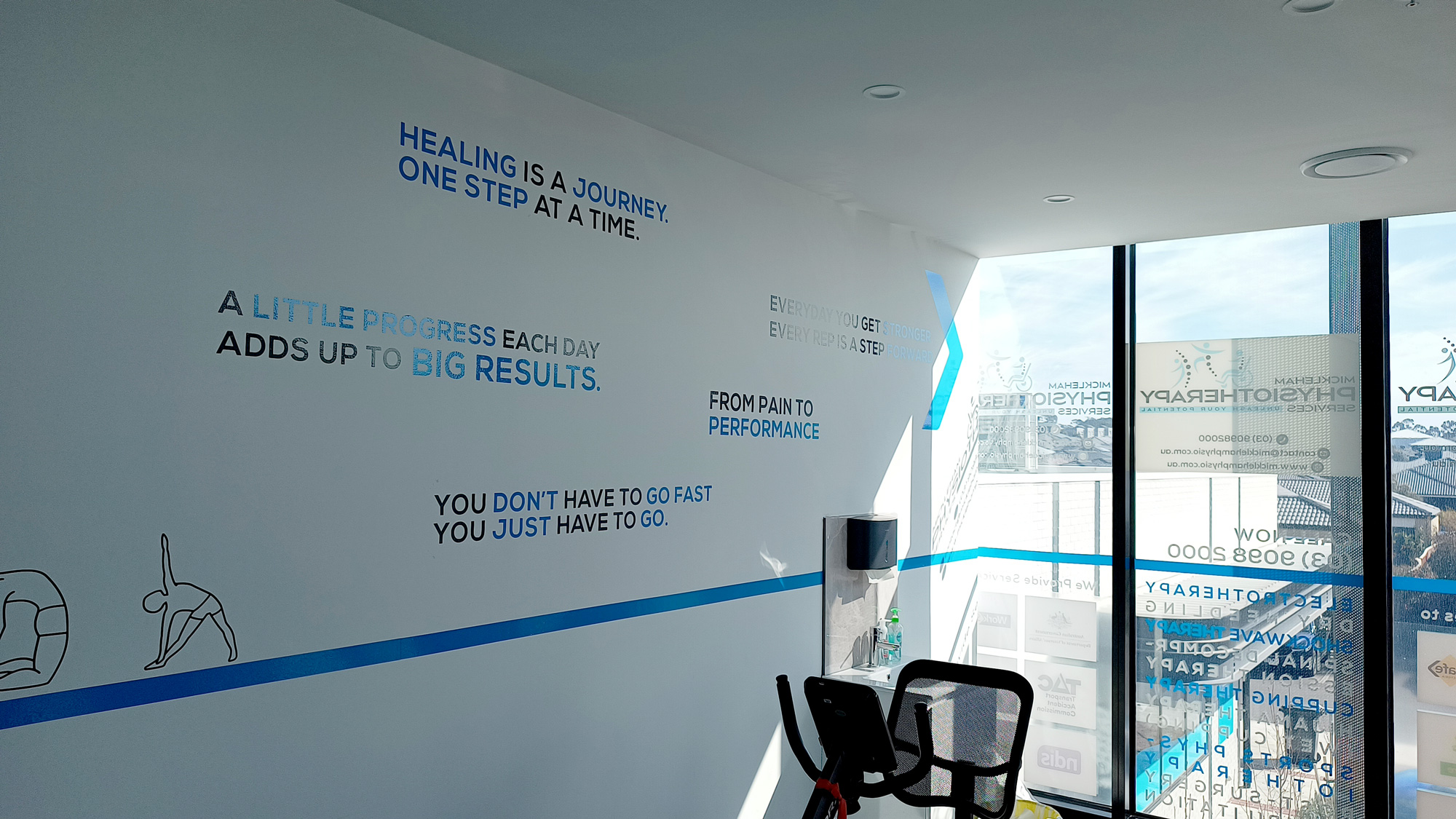 Motivational wall graphics in the exercise room, with carefully selected quotes to encourage and inspire patients during rehabilitation