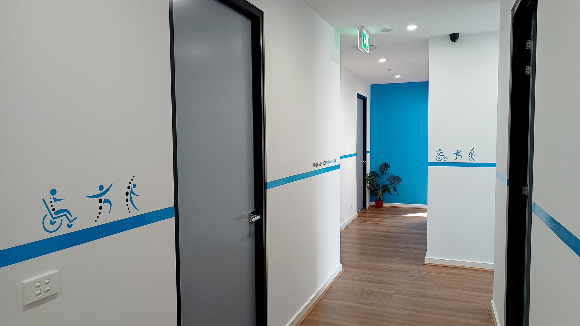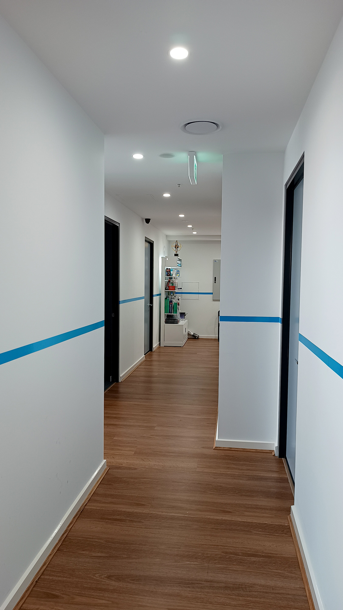 A continuous blue branding strip running throughout the clinic from reception to each doctor’s room, using the primary brand colour to visually connect all spaces