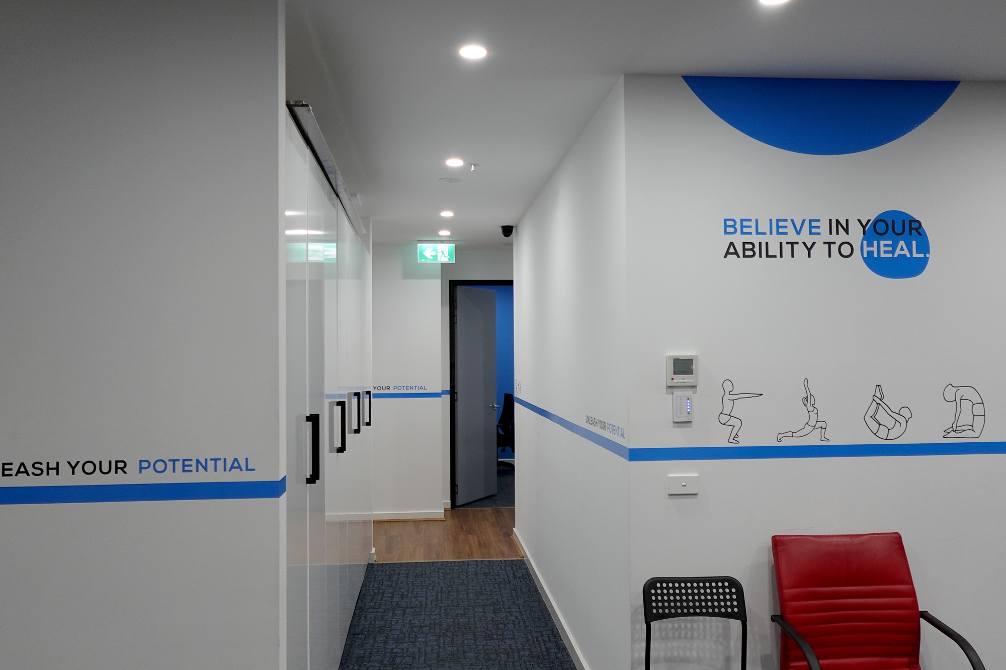 Logo feature walls in each doctor’s room to reinforce brand presence and professionalism
